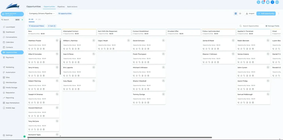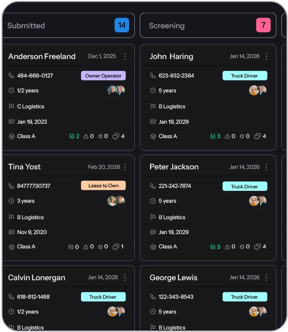 The system provides full visibility into applicant status, documentation, and communication history, ensuring that recruiting teams can efficiently move drivers through the hiring pipeline.